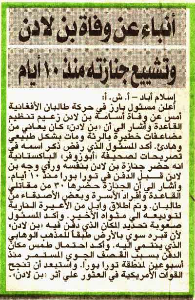 Um funcionário de destaque no movimento afegão dos Talibãs anunciou ontem a morte de Osama bin Laden, o chefe da organização Al-Q'aeda, indicando que Bin Laden sofreu sérias complicações nos pulmões e morreu de morte natural e tranquila. O funcionário, que pediu para permanecer anônimo, disse ao jornal The Observer do Paquistão, que ele próprio foi ao funeral de Bin Laden e viu seu rosto antes do enterro em Tora Bora 10 dias atrás. Ele mencionou que 30 combatentes da Al-Q'aeda compareceram ao enterro, assim como membros da sua família e alguns amigos do Talibã. Na cerimónia de despedida ao seu descanso final, tiros de armas foram disparados para o ar. ![]() Ampliação do Texto do relato da notícia da morte e o enterro de Bin Laden em dezembro de 2001 publicado em jornal do Egito. O funcionário afirmou que é difícil identificar o local do enterro de Bin Laden, porque segundo a tradição Wahhabi não é deixada pistas pelo túmulo. Ele ressaltou que é improvável que as forças americanas jamais iriam descobrir vestígios de onde bin Laden foi enterrado. For media inquiries: media@globalresearch.ca - Copyright © , Al-Wafd (translated from the Arabic), 2001 |