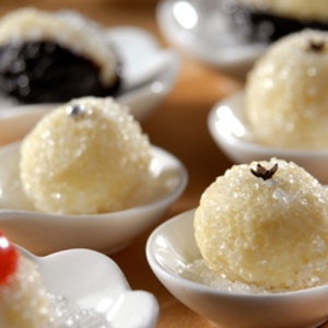 Faça os beijinhos com a ajuda de uma colher de chá, passe-os pelo açúcar cristal e finalize com um cravo-da-índia.